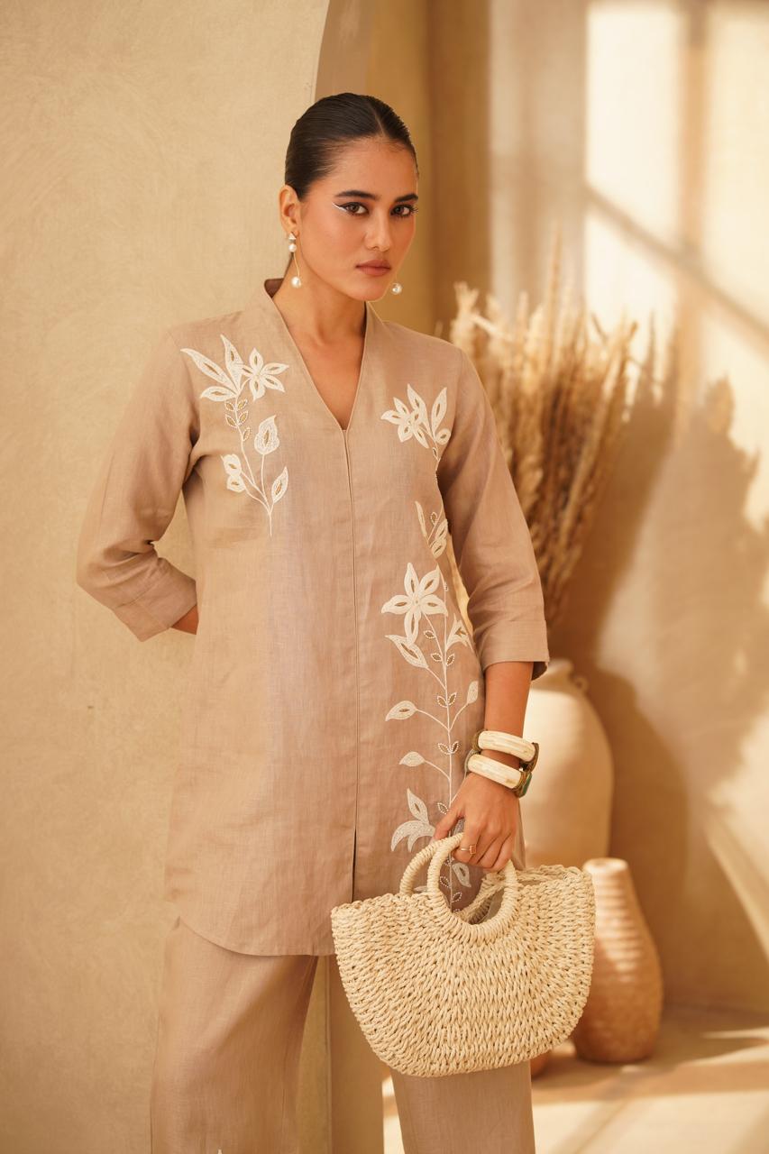 Crafted from premium pure linen, this beige cord set for women combines natural elegance with superior comfort. The breathable fabric ensures all-day freshness, while the fine quality guarantees durability and a refined finish. Ideal for those seeking understated sophistication and timeless style in their wardrobe.