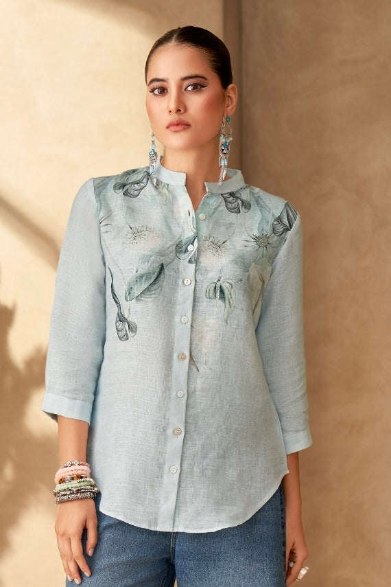 Crafted from breathable linen, the Serene Petals shirt offers timeless comfort and effortless style. Its flattering silhouette and subtle detailing make it an ideal choice for pairing with denim, creating a chic yet relaxed look. Designed for women who value both elegance and ease, this shirt seamlessly transitions from casual outings to refined gatherings.